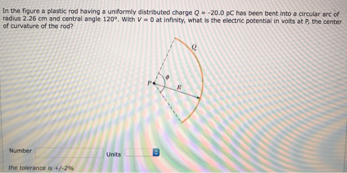 Solved In Fig 24 43 A Plastic Rod Having A Uniformly Distributed Charge Q 25 6 Mathrm Pc Has Been Bent Into A Circular Arc Of Radius R 3 71 Mathrm Cm And Central Angle Phi 120 Circ With V 0 At